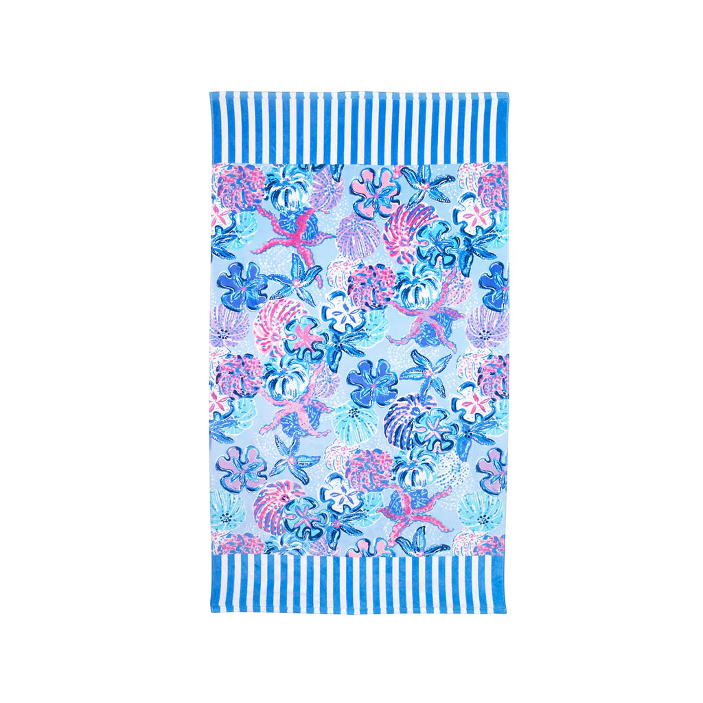 Make waves poolside or seaside with Lilly's luxe beach towel. The full patterned cotton towel has a vibrant Bahamas Beachcomber print, it's a great way to add some Lilly to your sunny day style.