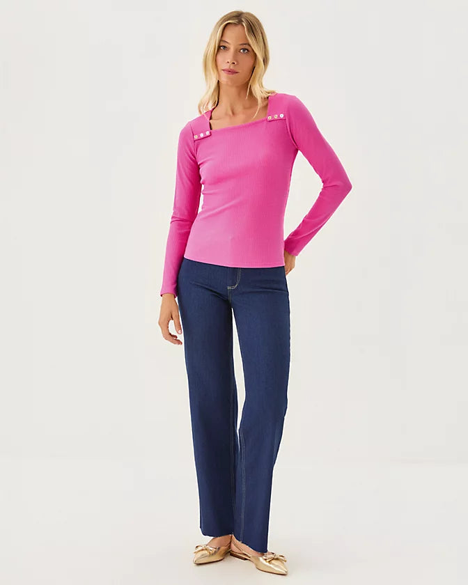 - Straight fit top with a squared neckline, long sleeves, and branded buttons on the neckline.