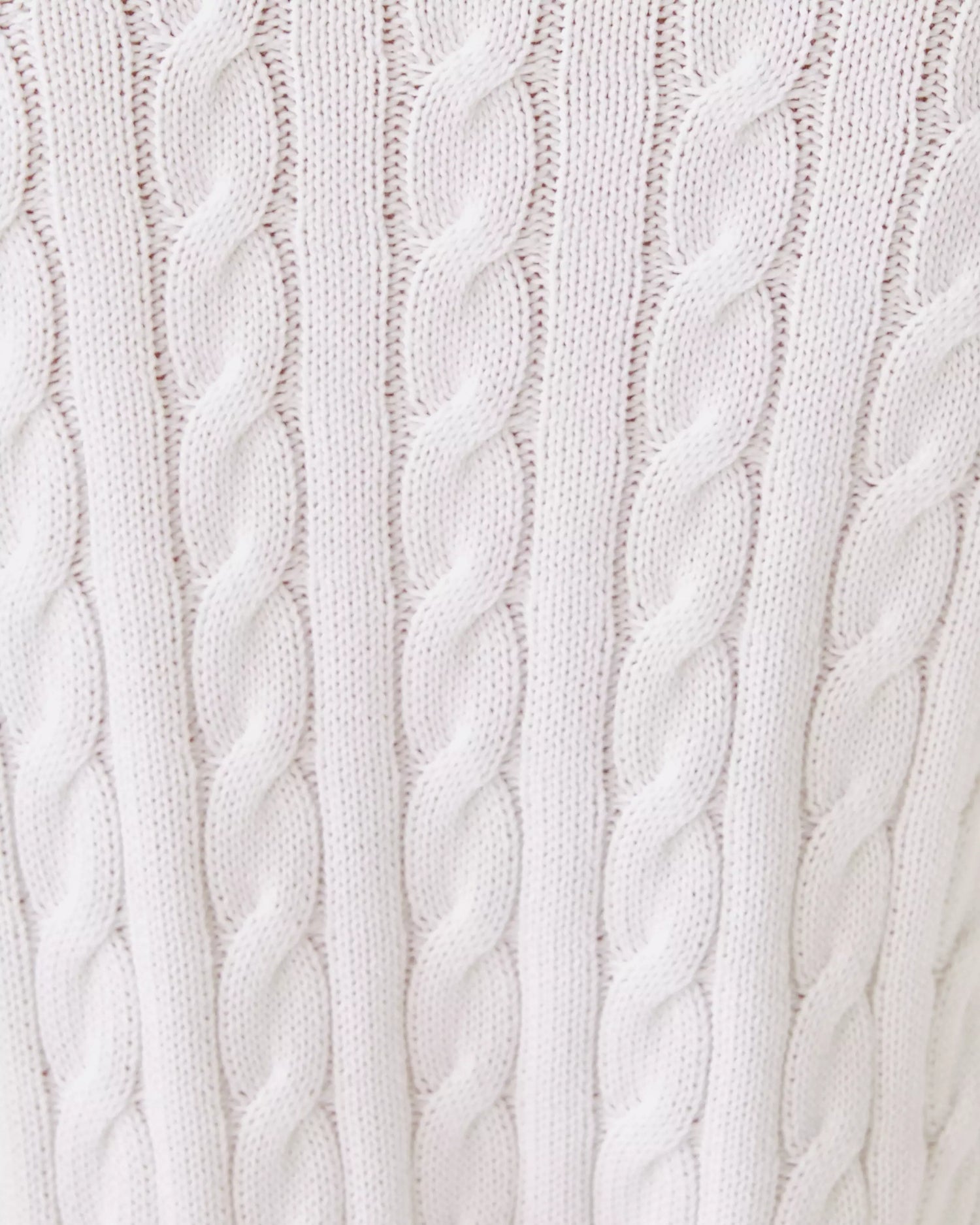 - Straight fit, v-neck, cable knit sweater with striping details at the trim.