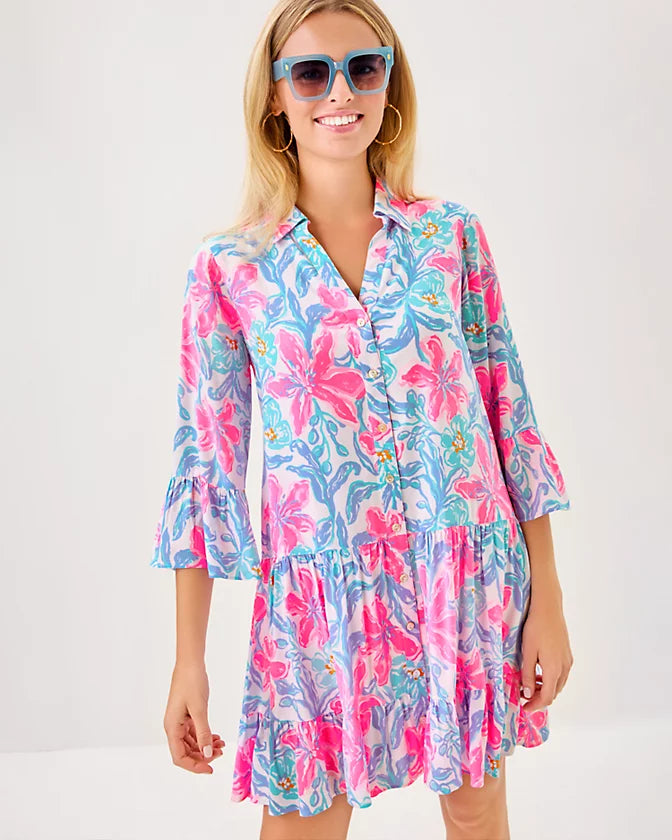 - Easy fit, tiered shirtdress with a collar and 3/4 length ruffle-hem sleeves.